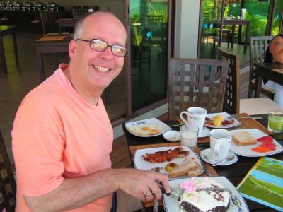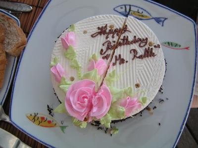 Gestern abend haben wir im Hotelrestaurant gegessen. Anschließend gab es an der Bar noch einen Absacker. Ralph ist mal kurz aufs Zimmer, da haben mich die Kellner bestürmt: "Your husband has his birthday today?".